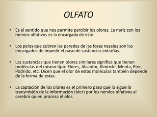 Este documento describe los cinco sentidos principales del cuerpo humano: tacto, visión, audición, olfato y gusto. Para cada sentido, explica brevemente los órganos involucrados y cómo perciben las diferentes sensaciones. El tacto se percibe a través de terminaciones nerviosas en la piel. La visión involucra la captación de luz por el ojo y su procesamiento en el cerebro. La audición implica la captura de vibraciones por el oído externo, medio e interno. El olfato se da a través de la