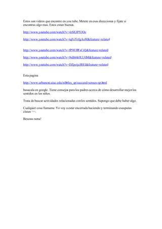 El documento comparte varios enlaces de YouTube y una página web con consejos para padres sobre cómo desarrollar los sentidos en los niños. También sugiere buscar actividades relacionadas con los sentidos y se despide con un beso.