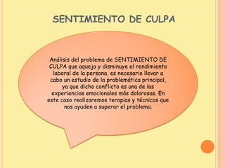 El documento trata sobre el sentimiento de culpa y su impacto en el rendimiento laboral. Explica que la culpa es una de las emociones más dolorosas y que puede causar estrés, aislamiento y baja autoestima. Propone varias técnicas como la meditación, actividades placenteras y el perdón propio para ayudar a superar sentimientos de culpa y mejorar el bienestar emocional.