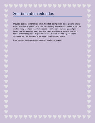 El documento describe los sentimientos encontrados que una persona puede tener hacia un balón de básquetbol redondo y anaranjado. Aunque es solo un objeto, el balón puede hacer que alguien sienta pasión, compromiso, amor y felicidad. Un día se le puede culpar cuando las cosas salen mal, pero luego se le ama cuando las cosas salen bien y se está listo para lanzarlo a canasta, sintiendo sus texturas y detalles. Para el autor, el balón representa más que un simple objeto y es una forma de vida.