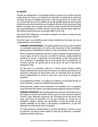 Este documento presenta las ideas de David Silva Villanueva sobre tres tipos de humanos modernos (convencional, pensante y sensible) y propone una nueva forma de adquirir conocimiento basada en el sentir en lugar de la ciencia tradicional. Argumenta que la ciencia actual depende de conocimientos heredados en lugar de descubrimientos propios y limita la evolución humana. Comparte una experiencia de la infancia que cree que demuestra la capacidad del sentir.