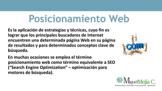 El documento proporciona información sobre posicionamiento web. Explica que el posicionamiento web involucra estrategias para que los principales buscadores encuentren una página web para determinadas palabras clave. También habla sobre optimización para motores de búsqueda (SEO) y factores como diseño, contenido, títulos, descripciones, imágenes y velocidad de carga que afectan el posicionamiento.