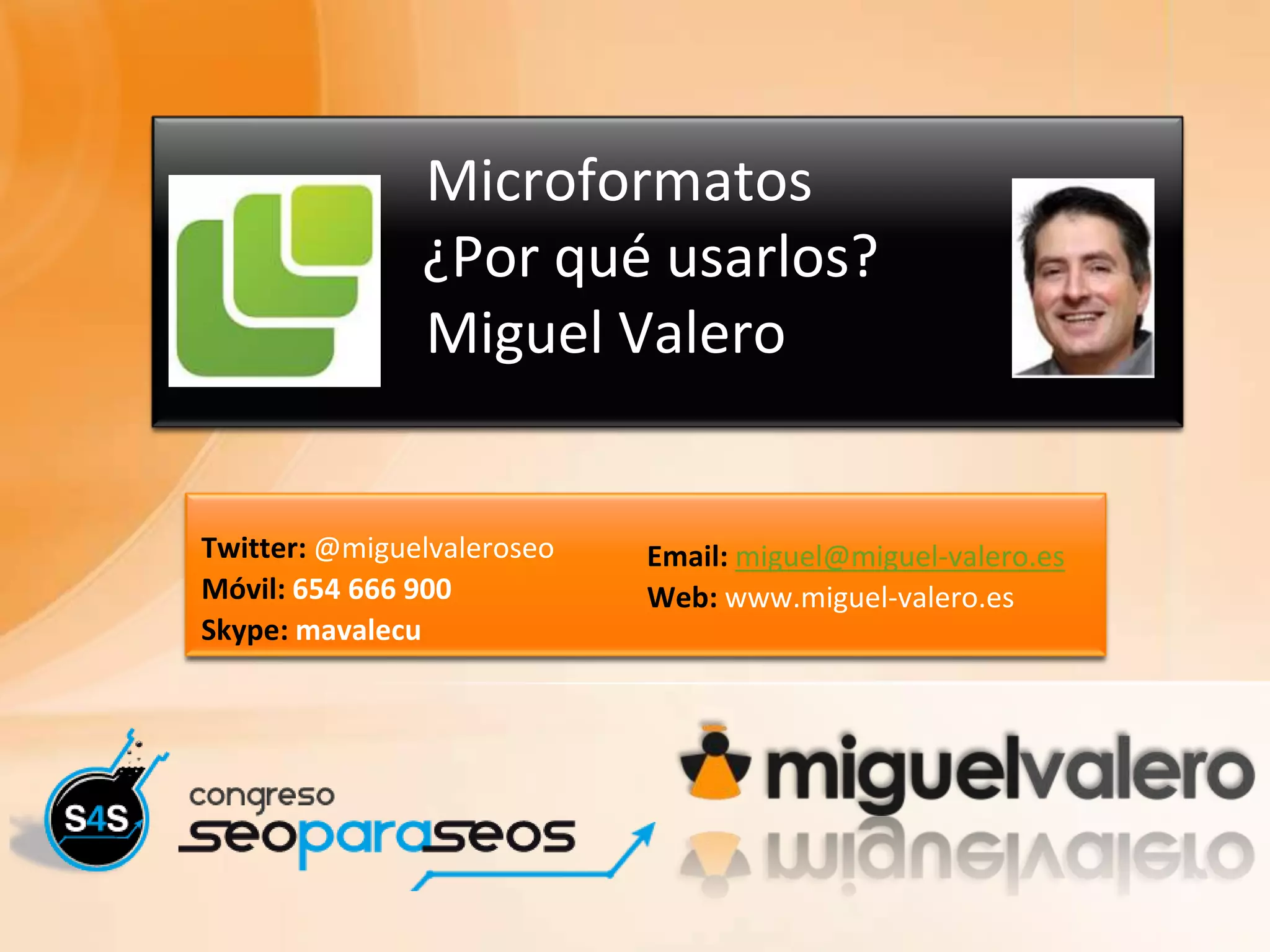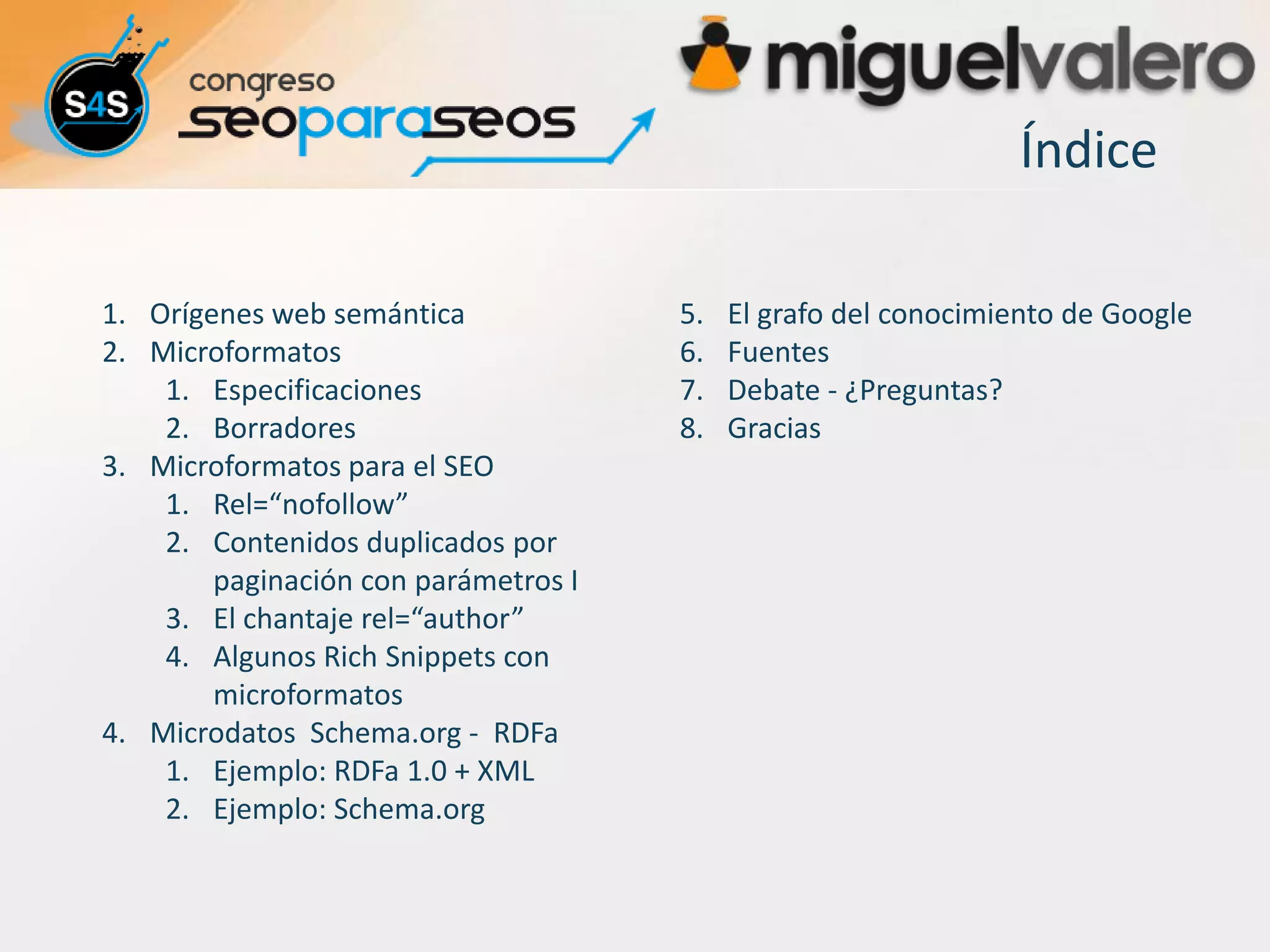 El documento explora el uso de microformatos y microdatos en la web semántica, destacando su evolución histórica y especificaciones técnicas. Además, se discute la importancia de estos elementos para el SEO y cómo influyen en la visibilidad en los motores de búsqueda, así como la implementación de rich snippets. Finalmente, se menciona el avance hacia una búsqueda más semántica con el grafo del conocimiento de Google.