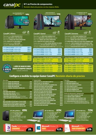 Este documento proporciona información sobre productos y servicios de informática de la tienda CanalPC, incluyendo precios y especificaciones técnicas de ordenadores, portátiles, tabletas, componentes y periféricos. También detalla servicios de reparación y financiación ofrecidos. La tienda realiza actualizaciones diarias de precios y ofrece 5 años de mano de obra gratuita en equipos CanalPC.
