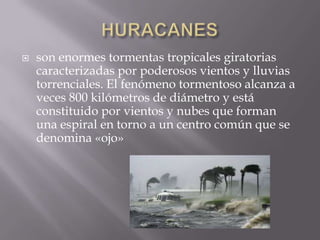Los huracanes son enormes tormentas tropicales caracterizadas por poderosos vientos y lluvias torrenciales que pueden alcanzar los 800 km de diámetro con vientos y nubes formando una espiral alrededor de un ojo central.