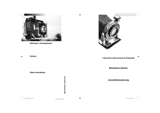 El documento anuncia el evento Fotográfica Bogotá organizado por el Fotomuseo para celebrar sus 5 años. Incluye más de 20 exposiciones de fotografía, 13 conferencias sobre documento y ficción en la fotografía por pensadores nacionales e internacionales, y un homenaje a Susan Sontag. Detalla los costos, fechas, lugares e información para inscribirse en el evento.