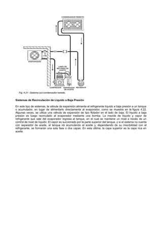 Este documento describe los diferentes tipos de sistemas de refrigeración y la importancia de instalar separadores de aceite en cada uno. Explica que los separadores de aceite evitan problemas como la falta de lubricación en los compresores, la acumulación de aceite en tanques o líneas, y el congelamiento de aceite en evaporadores. Los sistemas discutidos incluyen compresores herméticos, condensadores remotos, recirculación de líquido a baja presión, paralelos, doble etapa y en cascada. En cada caso, se