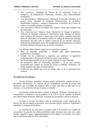 El documento presenta una introducción a los envases y embalajes, definiendo sus funciones y tipos primarios, secundarios y terciarios. Explica que cumplen un rol protector del producto y comunicacional hacia el consumidor. Luego define materiales comunes como metal, papel, vidrio y plástico, detallando propiedades y usos de envases metálicos como latas y características de lacas. Finalmente, analiza el rol del color y factores psicológicos en la atracción y percepción del consumidor.