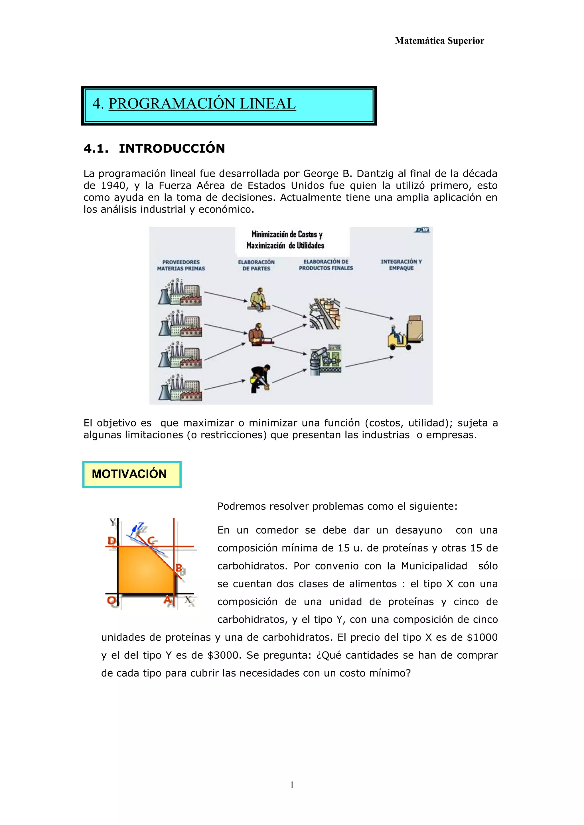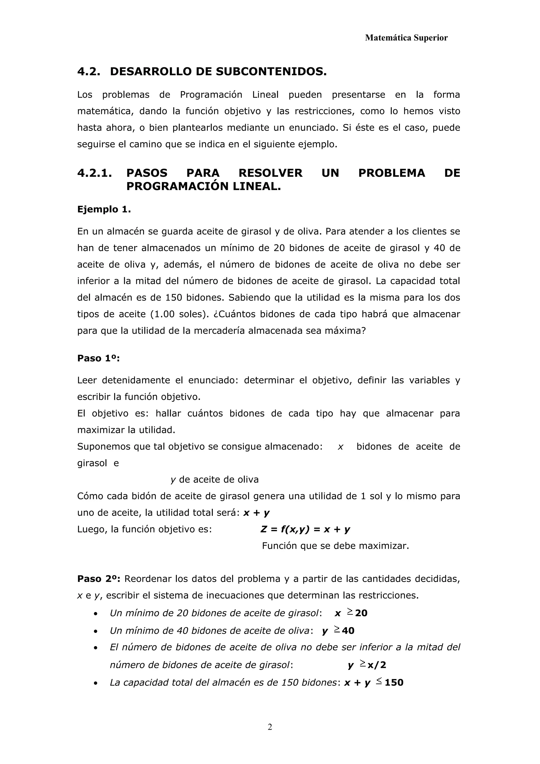 Este documento describe los pasos para resolver problemas de programación lineal. Explica que la programación lineal involucra maximizar o minimizar una función objetivo sujeta a restricciones. Luego presenta cuatro ejemplos que ilustran cómo formular los problemas matemáticamente identificando la función objetivo, variables, restricciones y región factible, y encontrar la solución óptima evaluando la función en los vértices de la región.