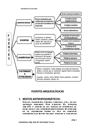 Este documento resume la historia de la cultura y el desarrollo de la sociedad humana en el Perú desde los primeros pobladores hace 20,000 años hasta la actualidad. Explica los conceptos básicos de la historia como ciencia social, las fuentes para reconstruir el pasado como fuentes arqueológicas, escritas y lingüísticas, y la división de la historia del Perú en períodos como pre-inca, inca, invasión hispánica e independencia política. Además, brinda detalles sobre el poblam