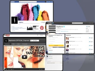 Este documento presenta un caso de estudio sobre Sephora Cosméticos. Sephora es una cadena de tiendas que venden productos de cosmética y belleza de grandes marcas. Su misión es ser una autoridad en belleza y ofrecer una experiencia de compra innovadora para hombres y mujeres. El documento analiza factores críticos como gastos en medios, crecimiento en visitas al sitio web, y tendencias de compradores en línea. También presenta recomendaciones como diseñar campañas de marketing benéficas y realizar encuestas de client