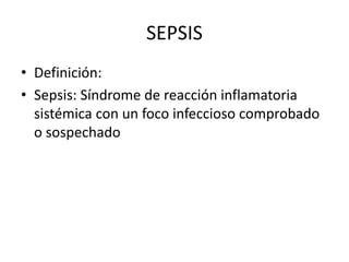 El documento define la sepsis, sepsis grave y choque séptico. Explica que la sepsis es una reacción inflamatoria sistémica a una infección, que puede progresar a sepsis grave con disfunción de órganos y choque séptico con hipotensión refractaria. También describe la fisiopatología de la respuesta inflamatoria y los mecanismos que llevan al choque circulatorio.