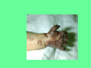 Este documento proporciona información sobre sepsis neonatal y pediátrica. Define sepsis y sus etapas como infección, bacteriemia, síndrome de respuesta inflamatoria sistémica, sepsis grave y choque séptico. Detalla factores de riesgo, manifestaciones clínicas, etiología, fisiopatología, diagnóstico y tratamiento con antibióticos, líquidos intravenosos y agentes inotrópicos. Resalta la importancia de la prevención a través de vacunas contra patógenos comunes como H. influenza