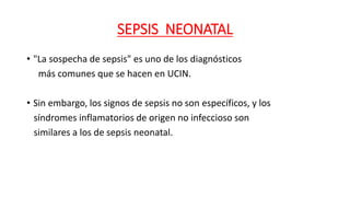 La sepsis neonatal es una infección sistémica que ocurre en los recién nacidos menores de 28 días de vida. Los desafíos para los clínicos son identificar rápidamente a los recién nacidos con alta probabilidad de sepsis, distinguir a los de alto riesgo de los sanos, y suspender el tratamiento antimicrobiano una vez que la sepsis se considera poco probable. Los signos de sepsis no son específicos y es importante realizar exámenes de laboratorio como hemograma, proteína C reactiva y hemocultivos para el diagnóstico. El