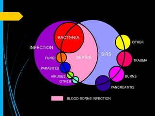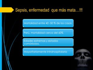Este documento trata sobre el shock séptico. Explica que la mortalidad por sepsis es alta, entre el 40-60% de los casos, y ocurre principalmente en hospitales. Describe las definiciones actuales de sepsis, sepsis severa y shock séptico según las guías de 2012. Resalta que la terapia temprana con objetivos definidos mejora los resultados, reduciendo la mortalidad al 30.5% comparado con el 46.5% del grupo control. Finalmente, provee recomendaciones sobre el modo de actuación frente a la sepsis severa y shock séptico.