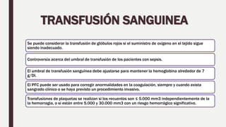 Este documento proporciona recomendaciones sobre el manejo anestésico de pacientes sépticos. Se recomienda considerar la transfusión de glóbulos rojos si el suministro de oxígeno en el tejido sigue siendo inadecuado, y ajustar el umbral de transfusión sanguínea para mantener la hemoglobina alrededor de 7 g/Dl. La oxigenoterapia suplementaria es valiosa incluso en pacientes sépticos sin dificultad respiratoria. La intubación traqueal inmediata y la vent