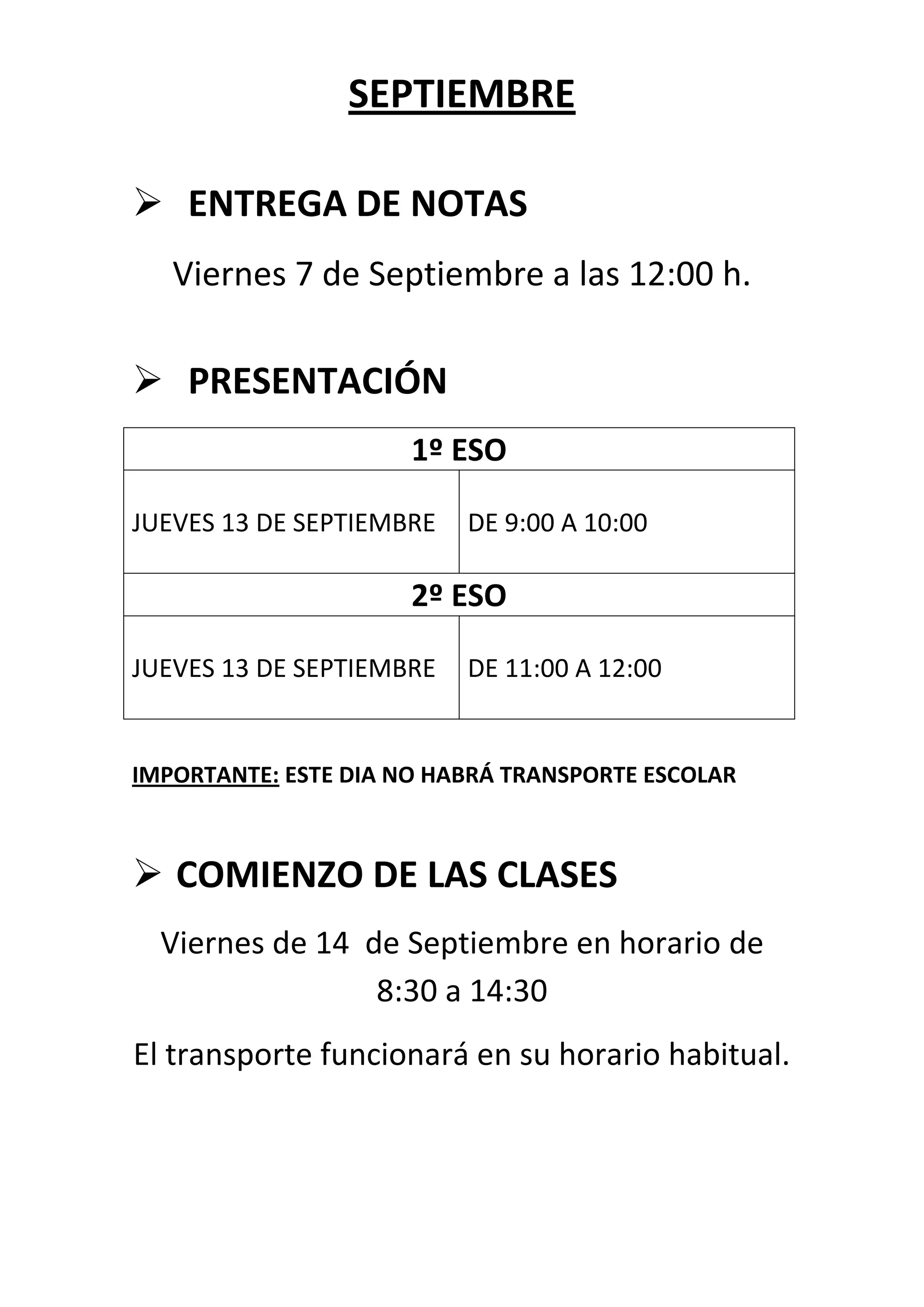 El documento detalla eventos y fechas importantes para el mes de septiembre en la escuela. Se entregarán notas el 7 de septiembre. Habrá presentaciones para los estudiantes de 1o y 2o ESO el 13 de septiembre. Las clases comenzarán el 14 de septiembre en el horario habitual de 8:30 a 14:30, aunque el 13 de septiembre no habrá transporte escolar disponible.