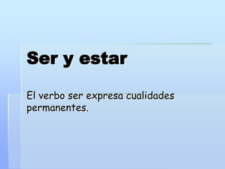 Este documento explica la diferencia entre los verbos ser y estar en español. Ser se usa para expresar cualidades permanentes como la identidad, nacionalidad, posesión, materiales y situaciones de eventos. Siempre se usa ser con sustantivos. El documento proporciona ejemplos de cómo y cuándo usar ser con diferentes sustantivos.