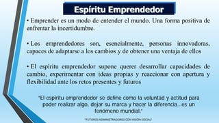 El documento describe las características de un emprendedor y el espíritu emprendedor. Un emprendedor se define como alguien innovador, capaz de asumir riesgos y aprovechar oportunidades. Las características clave de un emprendedor incluyen la constancia, el liderazgo, la responsabilidad personal y la capacidad de reconocer oportunidades. Ser emprendedor tiene tanto beneficios como desventajas, como ganar independencia pero también asumir grandes riesgos y responsabilidades.