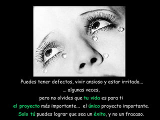Este documento habla sobre lo que significa ser feliz. Explica que ser feliz no es evitar problemas o decepciones, sino tener la fuerza para perdonar, la esperanza en las batallas, y el amor a pesar de los desencuentros. También dice que ser feliz es apreciar la vida a pesar de los desafíos, tener la madurez para reconocer los errores, y ver la vida como una oportunidad en lugar de un problema. El mensaje principal es que cada persona es el protagonista de su propia vida y debe cultivar la tolerancia para aprovechar