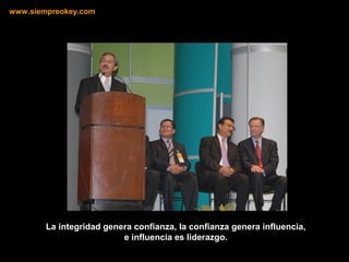 El documento describe la importancia de la integridad y cómo genera confianza y liderazgo. Ser íntegro significa reconocer los errores cometido en lugar de ocultarlos. Aunque ser honesto puede traer consecuencias negativas temporalmente, mantener la integridad conducirá a mayores recompensas a largo plazo. Solo aquellos que son íntegros triunfarán permanentemente.