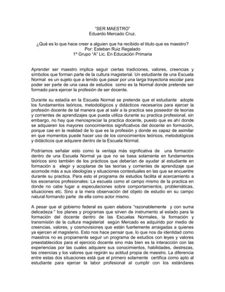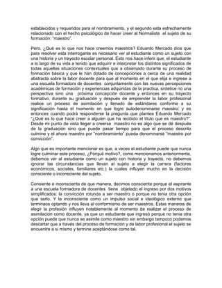 El documento discute el proceso de formación de un maestro y lo que lo hace sentirse como tal. Explica que se trata de un proceso gradual que involucra la adopción de la cultura y valores de la profesión magisterial a través de la experiencia en la escuela normal, así como el desarrollo de concepciones docentes a lo largo de la práctica y la carrera. Ser maestro no es solo cumplir con un plan de estudios, sino internalizar esta identidad a través de la interacción con otros maestros y la experiencia en el