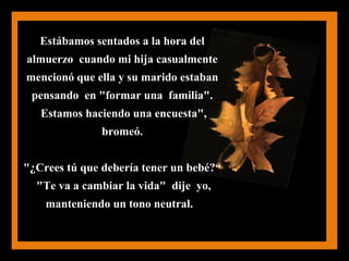 La hija le pregunta a su madre si debería tener un bebé. La madre quiere advertirle que la maternidad traerá profundos cambios emocionales y prioridades, haciéndola más vulnerable y centrada en la protección de su crío sobre todas las cosas. Aunque los cambios físicos sanarán, la maternidad la marcará de por vida. La madre desea transmitirle a su hija la alegría de ser madre, pero entiende que es una decisión que ella debe tomar.