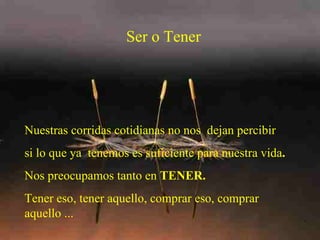 Este documento discute la diferencia entre ser y tener. Argumenta que las personas se enfocan demasiado en tener cosas materiales, lo que les impide disfrutar la vida y ser felices. En cambio, propone que ser amado, gentil y vivir el momento son más importantes que tener bienes materiales, ya que el ser lleva a una felicidad eterna mientras que el tener es pasajero.