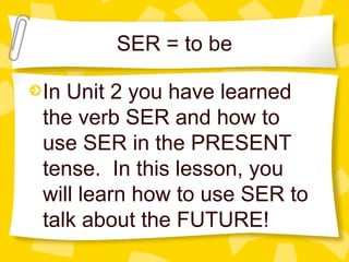 Este documento enseña cómo usar el verbo SER en el futuro en español. Explica las formas del futuro de SER y da ejemplos de cómo se puede usar para hablar sobre lo que será en el futuro.