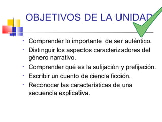 Este documento presenta los objetivos de una unidad didáctica sobre ser auténtico, géneros narrativos, sufijación y prefijación, ciencia ficción y secuencias explicativas. Entre los objetivos se encuentran comprender la importancia de ser auténtico, distinguir aspectos del género narrativo, entender sufijación y prefijación, escribir un cuento de ciencia ficción y reconocer características de una secuencia explicativa.