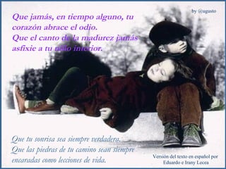 Este documento ofrece consejos para vivir una vida plena y feliz. En menos de 3 oraciones, recomienda no abrazar el odio, mantener la inocencia interior y sonreír de forma genuina; que la música acompañe los momentos de introspección; y que el amor guíe las acciones y transforme los momentos difíciles en celebración.