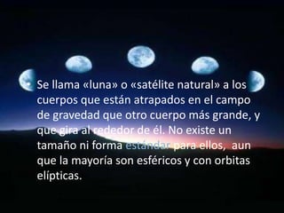 Este documento describe algunos de los satélites naturales más notables del sistema solar, incluyendo Ganímedes, el satélite más grande; Calisto, el objeto con más cráteres; e Io, el objeto más volcánicamente activo. También menciona las lunas Miranda de Urano, conocida por su superficie irregular única, y Dactyl, la primera luna descubierta orbitando un asteroide.