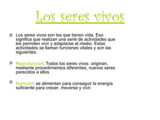 Este documento describe las características de los seres vivos, incluyendo su capacidad de reproducirse, nutrirse y adaptarse a su entorno mediante funciones vitales. Explica que las plantas también son seres vivos y que los animales se clasifican en grupos como peces, insectos, anfibios, reptiles, aves y mamíferos.