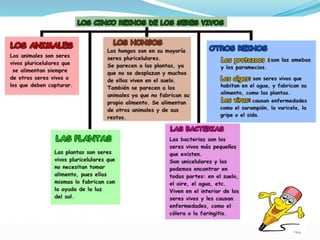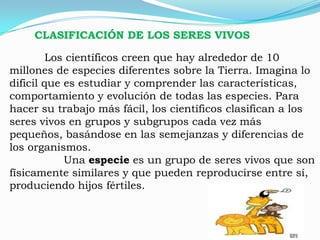 El documento clasifica y describe los seres vivos. Explica que los científicos clasifican a los seres vivos en grupos y subgrupos basados en sus semejanzas y diferencias. Describe dos tipos de nutrición - autótrofa y heterótrofa - y proporciona ejemplos de cada uno. Además, presenta una clasificación básica de los animales según su capacidad de movimiento, estructura interna, hábitat y dieta.