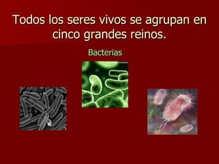 Los seres vivos se clasifican en cinco reinos principales: bacterias, algas, hongos, plantas y animales.