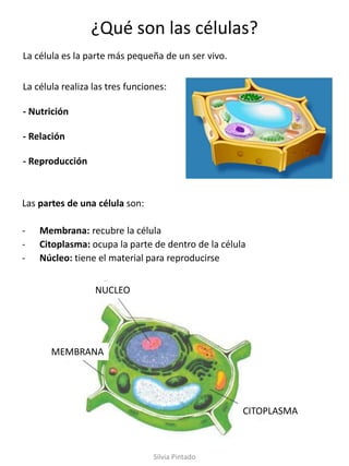 El documento describe los seres vivos, incluyendo las células, las partes de una célula, los tipos de seres vivos según si tienen una o más células, las funciones vitales como la nutrición y reproducción, y la clasificación de los seres vivos en cinco reinos: moneras, protoctistas, plantas, hongos y animales.