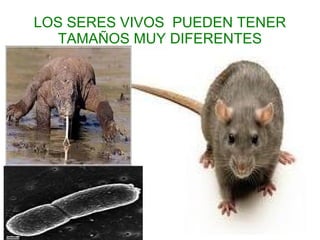Los seres vivos tienen funciones vitales como crecimiento, reproducción, alimentación, relación con el entorno y respiración. Están formados por células, que pueden ser unicelulares u pluricelulares, y por tejidos como el conectivo, epitelial, muscular y nervioso. Los órganos formados por los tejidos constituyen los aparatos vitales como el digestivo, respiratorio y reproductor.