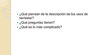 Este documento contiene instrucciones y ejercicios sobre el uso de los verbos ser y estar en español. Incluye prácticas de completar oraciones con ser o estar, adivinanzas usando estos verbos, traducciones de frases del inglés al español y preguntas originales para practicar. El documento ayuda a los estudiantes a distinguir entre ser y estar y cuando se usa cada uno.
