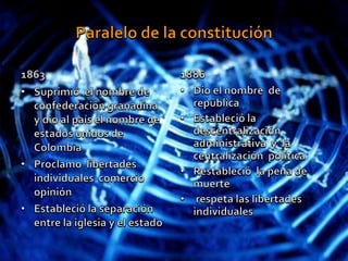 El documento compara las constituciones de 1863 y 1886 de Colombia. La constitución de 1863 cambió el nombre del país a Estados Unidos de Colombia, estableció libertades individuales y la separación entre la iglesia y el estado. Redujo el periodo presidencial y limitó el papel del estado. La constitución de 1886 cambió el nombre del país a República de Colombia, estableció la descentralización administrativa y la centralización política, y restableció la pena de muerte.