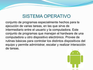 Este documento describe los componentes y tipos de sistemas operativos. Explica que un sistema operativo es un conjunto de programas que manejan el hardware y permiten la interacción entre el usuario y la computadora. Luego detalla los componentes principales como la gestión de procesos, memoria, archivos y dispositivos de entrada/salida. También clasifica los sistemas operativos en monotarea, monousuario, multiusuario, por lotes, tiempo real, tiempo compartido y distribuidos.