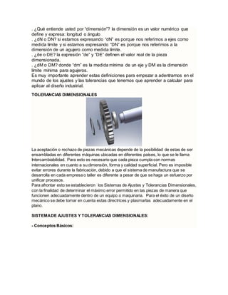Las tolerancias y ajustes son conceptos importantes en la fabricación de piezas mecánicas para garantizar su intercambiabilidad. Las tolerancias se refieren a los límites de error permitidos en las dimensiones de una pieza para que pueda ensamblarse correctamente. Los ajustes implican emparejar dos piezas a través de ejes y agujeros para que encajen de forma precisa. El documento explica estas definiciones clave y el sistema de tolerancias dimensionales utilizado internacionalmente para especificar los errores máximos permitidos en las piezas y