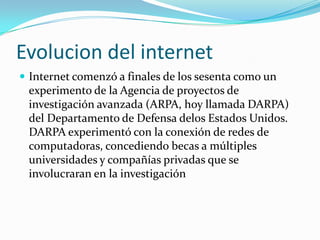 Internet comenzó en la década de 1960 como un experimento del gobierno de los Estados Unidos para conectar redes de computadoras entre universidades y empresas. Desde entonces, la web ha evolucionado de una versión básica de sólo texto (Web 1.0) a una que permite la interacción y colaboración de los usuarios (Web 2.0), y posiblemente hacia una futura Web 3.0 impulsada por la inteligencia artificial. Hoy en día, las tecnologías de la información juegan un papel fundamental en la sociedad y la economía.