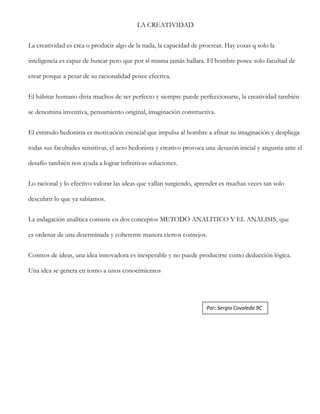 El documento habla sobre la creatividad y su importancia. Define la creatividad como la capacidad de crear o producir algo de la nada a través de la imaginación constructiva. Explica que a pesar de la racionalidad humana, el ser humano puede ser creativo gracias a su capacidad afectiva. También menciona que la creatividad ayuda a encontrar soluciones infinitas y que el aprendizaje a menudo implica descubrir lo que ya sabemos.