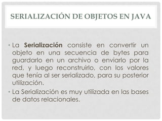 La serialización consiste en convertir un objeto en una secuencia de bytes para guardarlo o enviarlo por red, y luego reconstruirlo con los mismos valores. En Java, esta capacidad se llama persistencia. La serialización se usa de forma transparente en RMI para pasar parámetros y valores de retorno entre objetos remotos. Para que un objeto sea serializable, debe implementar la interfaz Serializable o Externalizable.