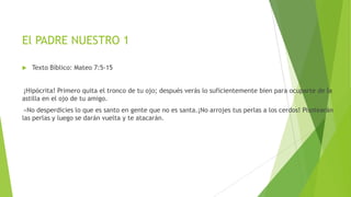 Este documento presenta un resumen de cinco puntos clave sobre lo que realmente se necesita para orar de manera eficaz según las enseñanzas de Jesús en Mateo 7:5-15. 1) Se debe tener la actitud correcta y humilde. 2) Apartarse a un lugar privado. 3) Hablar con Dios de forma abierta pero respetuosa. 4) Orar de forma integral, no sólo para pedir. 5) Hacer de la oración una disciplina deseada y un deleite.