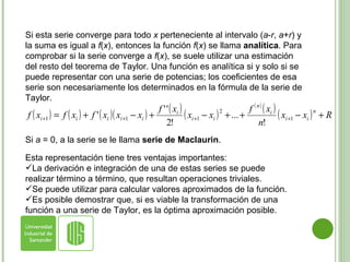 La serie de Taylor representa una función como una suma infinita de términos que involucran las derivadas sucesivas de la función en un punto. Si la serie converge a la función en cierto intervalo, la función se dice analítica. La serie de Taylor permite aproximar funciones, derivar e integrar series, y es la mejor aproximación posible de una función analítica.