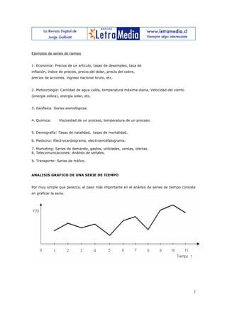 Este documento presenta métodos elementales de procesamiento de series de tiempo. Introduce el concepto de serie de tiempo y ofrece ejemplos. Explica que una serie de tiempo puede descomponerse en componentes de tendencia, estacionalidad y variaciones aleatorias. Describe métodos para estimar la tendencia usando regresión lineal y para estimar la componente estacional promediando valores mensuales. Ilustra los conceptos con dos ejemplos numéricos.