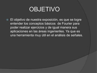 El documento explica los conceptos básicos de las series de Fourier, incluyendo su uso para representar funciones periódicas mediante la suma de senos y cosenos. Describe algunas aplicaciones importantes de las series de Fourier en el análisis de señales y en áreas como acústica y procesamiento de imágenes.