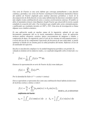 Una serie de Fourier es una serie infinita que representa funciones periódicas como la suma de funciones senoidales. Las series de Fourier se usan para analizar funciones periódicas descomponiéndolas en armónicos. Fueron estudiadas sistemáticamente por Jean-Baptiste Joseph Fourier, quien publicó resultados iniciales en 1807 y 1811. Las series de Fourier tienen aplicaciones en ingeniería, incluyendo análisis vibratorio, acústica y procesamiento de señales.
