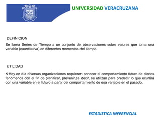 Este documento presenta información sobre series de tiempo y métodos de predicción como promedio móvil, suavización exponencial y Box-Jenkins. Describe que una serie de tiempo es un conjunto de observaciones de una variable cuantitativa a lo largo del tiempo y que estos métodos se usan para predecir valores futuros basados en datos pasados. Explica conceptos como tendencia, estacionalidad y estacionariedad y los pasos involucrados en la selección de un modelo de serie de tiempo apropiado.